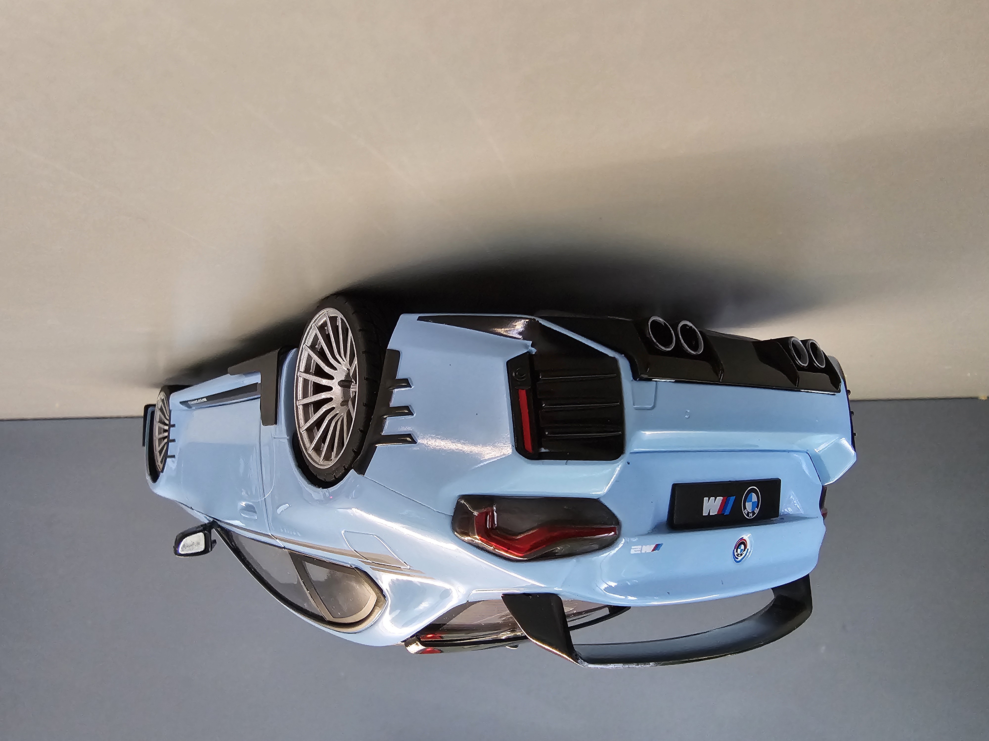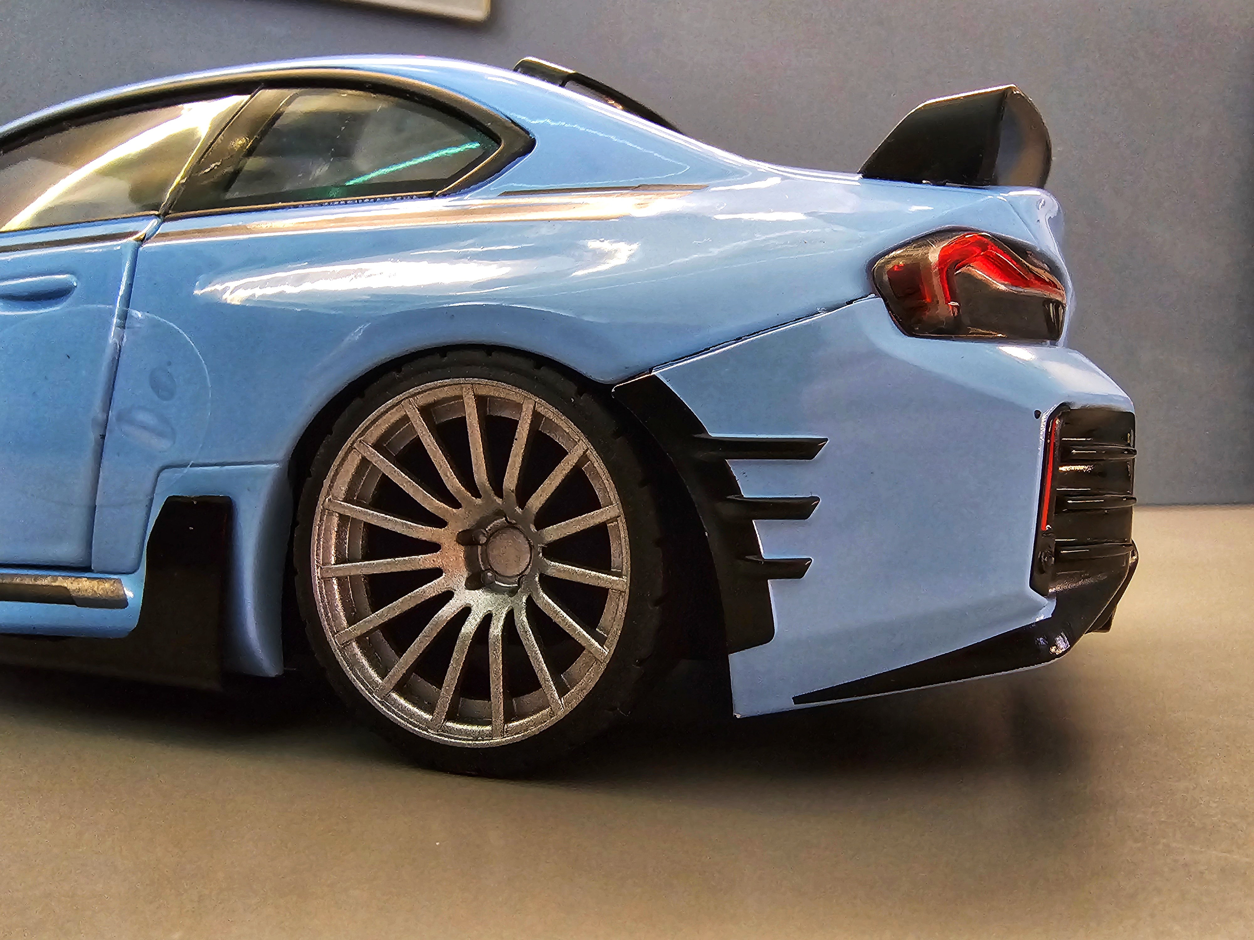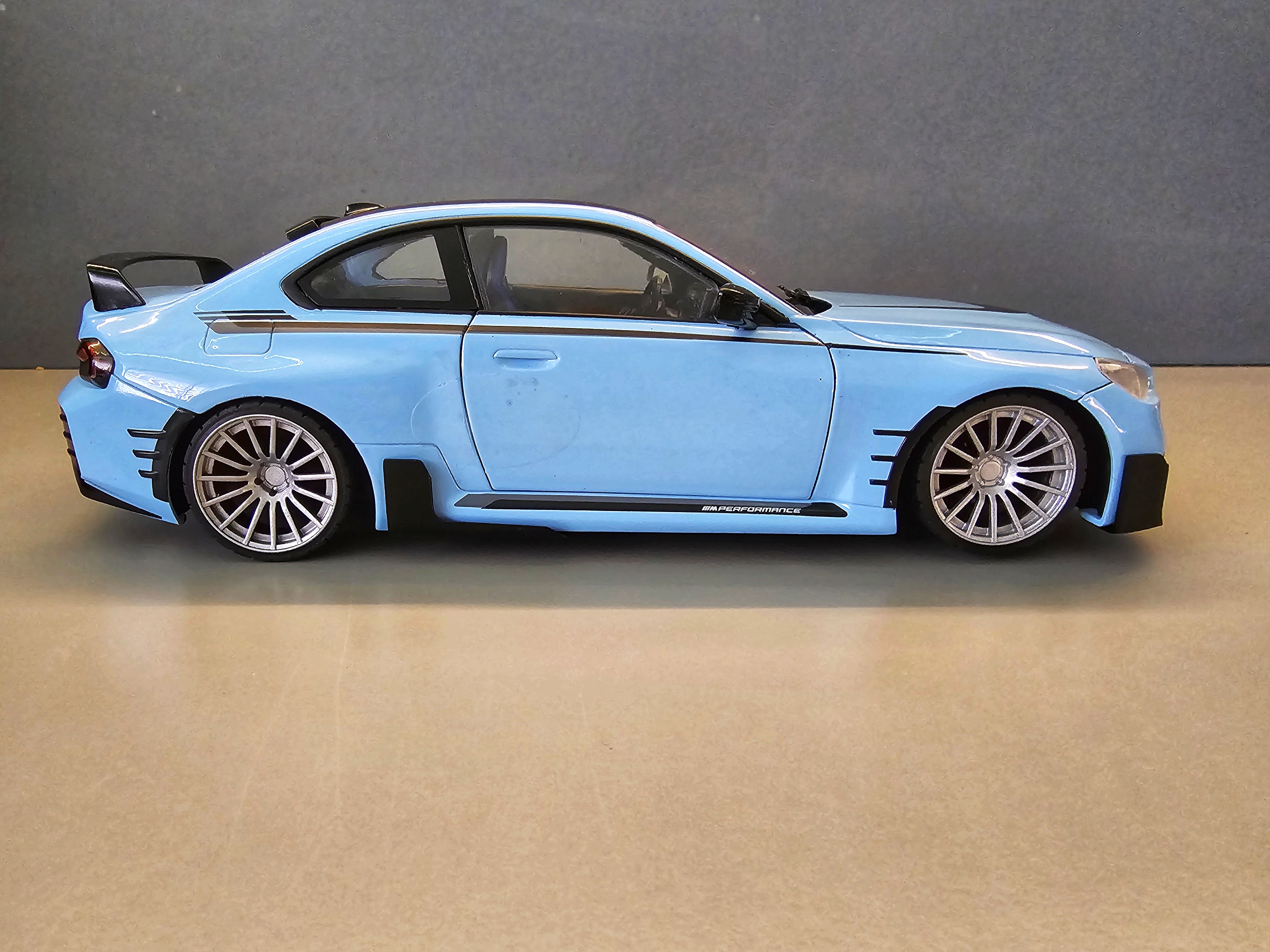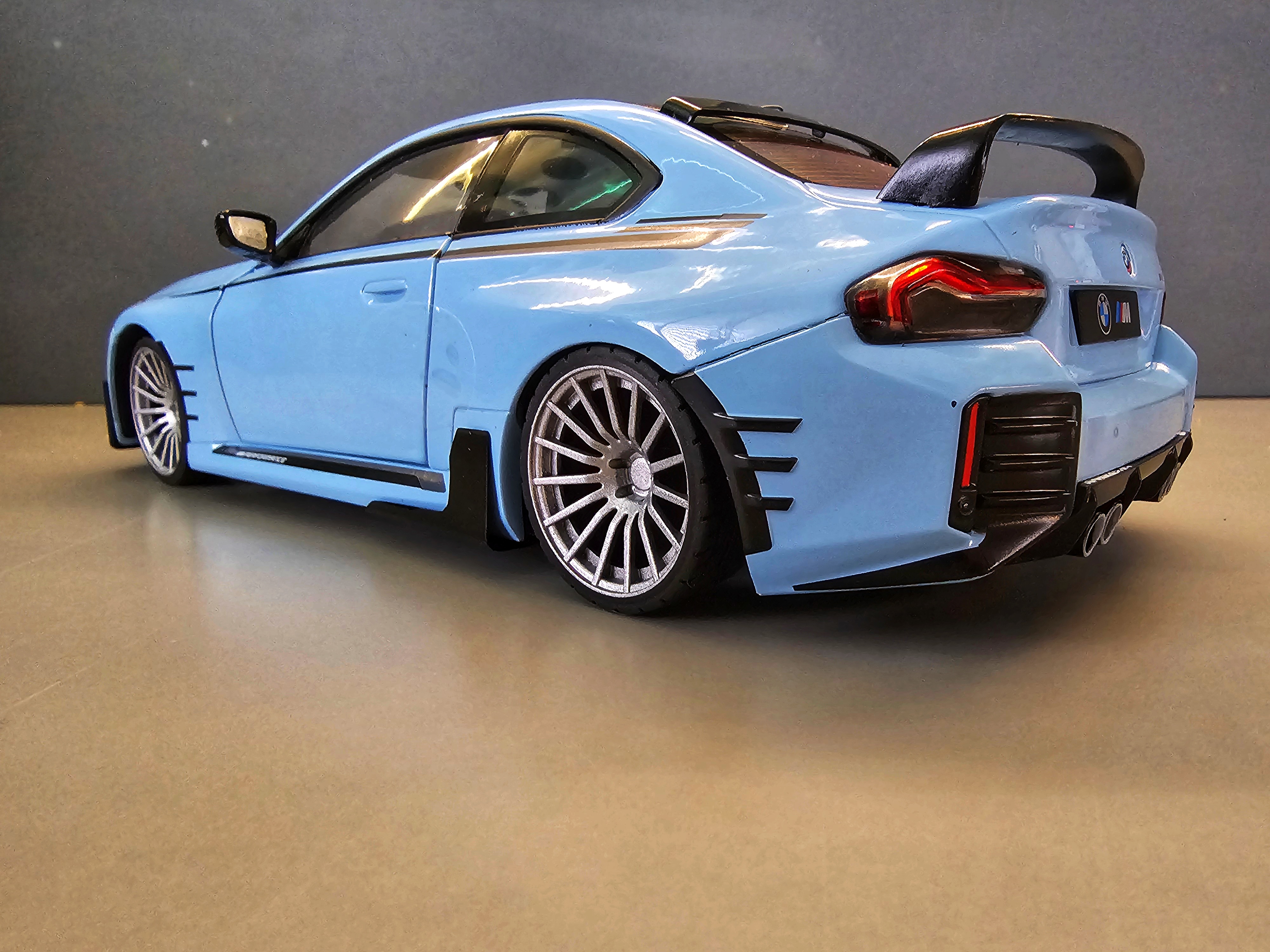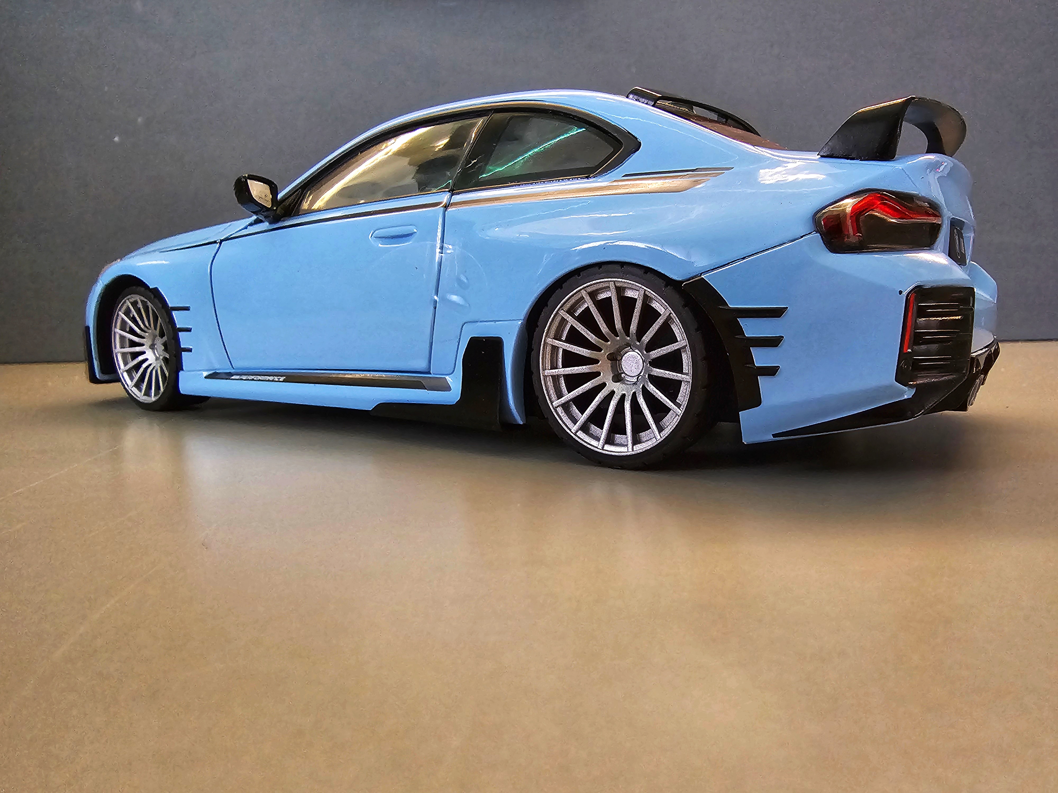 Custom Solido 1:18 BMW M2 (G87) 2024 – Upgraded with 19” Wheels & Lowered SuspensionElevate your diecast collection with this Custom Solido 1:18 BMW M2 (G87) 2024, a truly distinctive piece that goes beyond the standard factory release. This model has been professionally modified to capture the aggressive stance and performance flair of the real-world M2 Competition look — a perfect blend of precision engineering and collector-grade craftsmanship.Based on Solido’s highly detailed 1:18 scale replica, this custom version brings a striking upgrade in both aesthetics and realism. The original model has been enhanced with custom 19” alloy-style wheels, offering a sportier, more balanced proportion. The wheels feature realistic brake detail and low-profile tyres that perfectly complement the car’s dynamic silhouette. To complete the transformation, the suspension has been lowered for a more authentic and aggressive stance — mirroring the tuned M2 often seen in enthusiast builds and real-life track setups.Every detail of the 2024 BMW M2 is faithfully captured here, from its muscular body lines and sculpted flared arches to the precision paint finish and realistic interior trim. Doors, bonnet, and boot can be opened to reveal the engine bay, detailed cockpit, and boot area, showing Solido’s signature balance of display appeal and functionality.This is not just another production model — it’s a unique custom version aimed at serious collectors who appreciate fine-tuned detailing. Whether displayed in your cabinet or used as the centrepiece of a BMW performance lineup, this modified Solido M2 stands out with its perfect mix of OEM quality and custom flair.Scale: 1:18Model base: Solido BMW M2 (G87) 2024Finish: Professionally customizedFeatures: Opening doors, bonnet & bootUpgrades: 19” custom wheels, lowered stance, detailed brake setupMaterial: Diecast metal with plastic and rubber componentsPackaging: Supplied in original Solido box (may be opened for customization)Perfect for collectors of modern BMWs, Solido enthusiasts, or anyone who loves tuned performance cars in scale form. Limited modified examples available — each with its own distinctive stance and wheel finish.Bring home a true one-off custom M2 that looks as sharp in your display case as the real car does on the road.